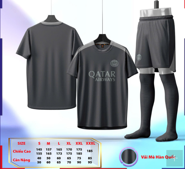 Mẫu áo bóng đá CLB PSG màu xám mùa 2025–2026 mang phong cách hiện đại đúng chất Paris Saint-Germain. Tông xám chủ đạo tạo cảm giác mạnh mẽ, tối giản và dễ phối đồ, phù hợp mặc đi đá bóng, tập luyện hoặc diện thể thao hằng ngày.